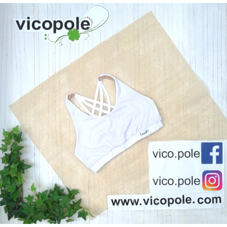 Top modelo Victory, diseño al frente con dos lineas sobrepuestas sobre el pecho simulando una V, en la espalda tiene seis tiritas entrecruzadas que forman una red; Confeccionado con suave licra aterciopelada simulando la textura de el ante.