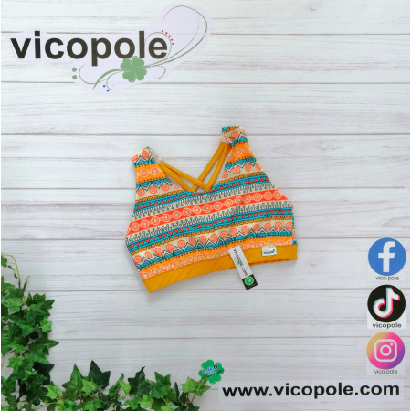Top tiritas en licra combinacion de tela color mostaza y tela estampada en grecas de ornamento.