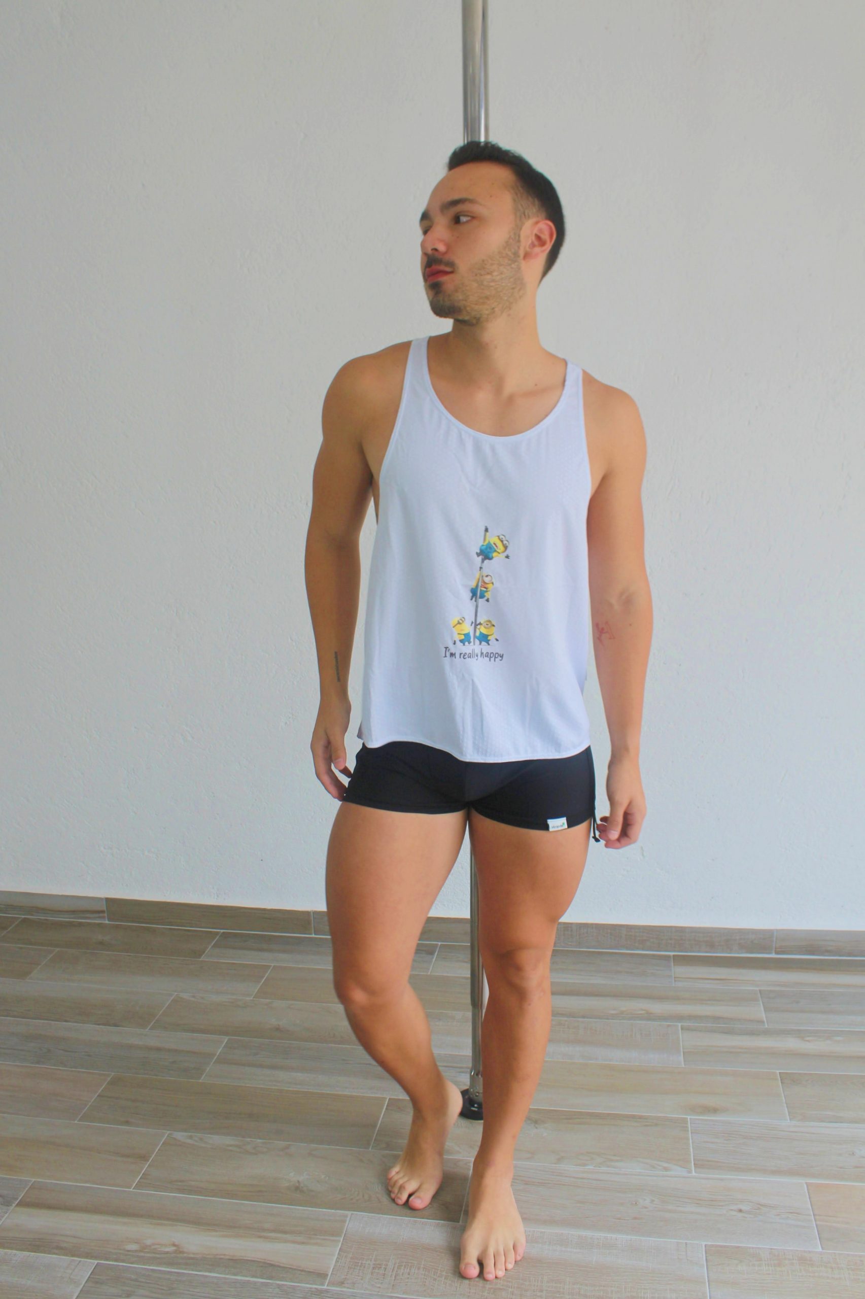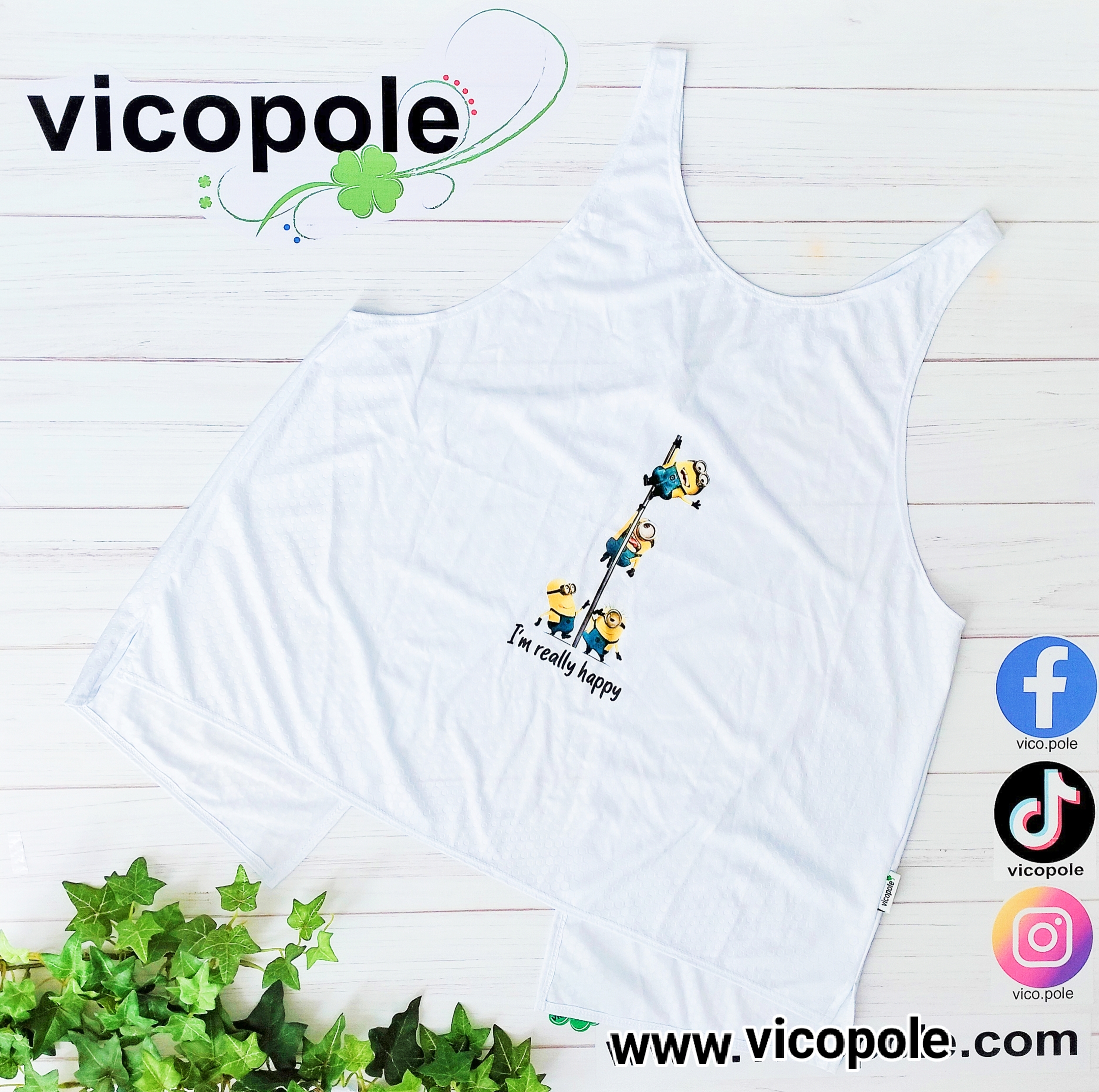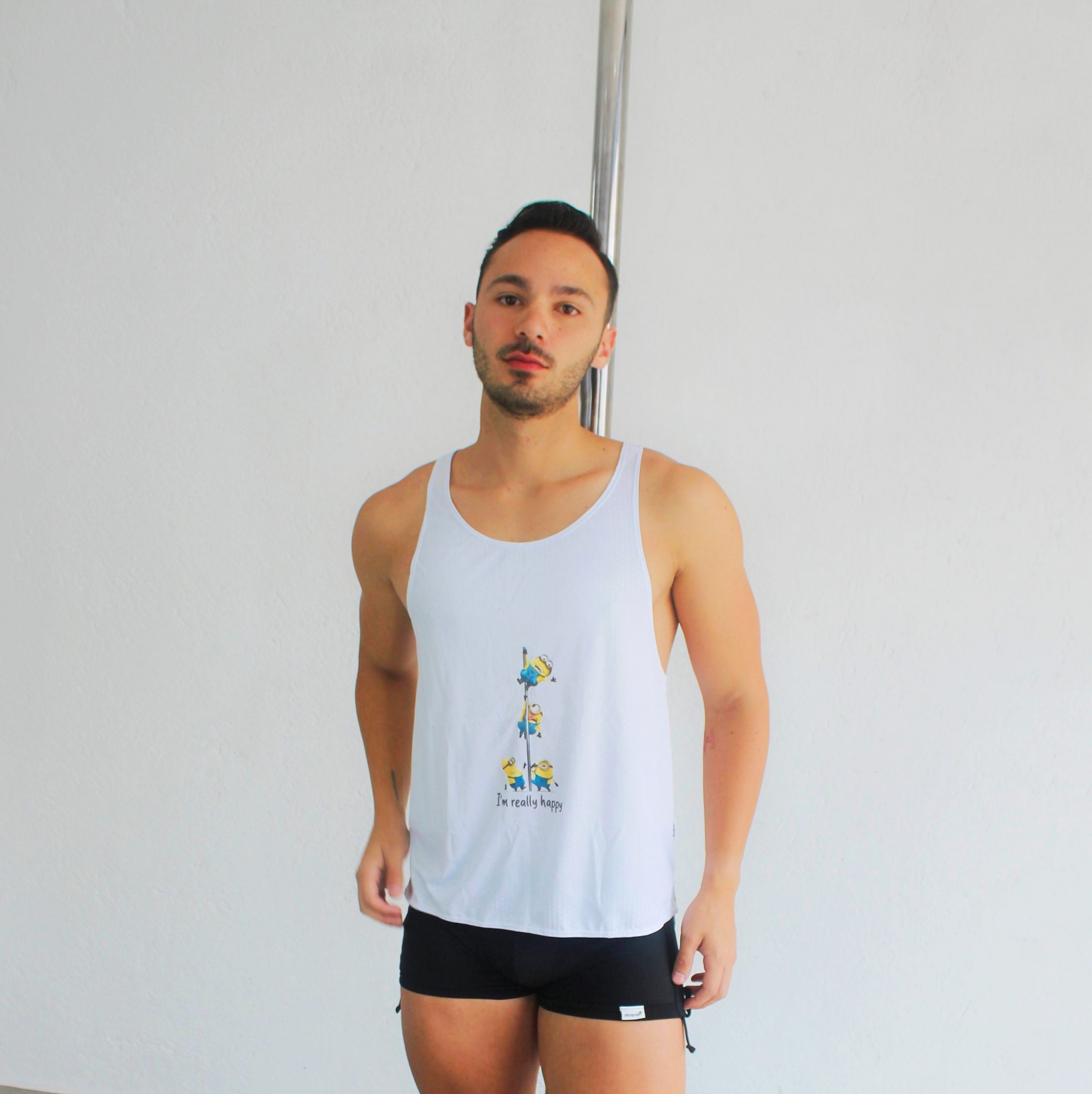 Playera blanca, estampada a color con Minions polers, que juegan al subir un pole.