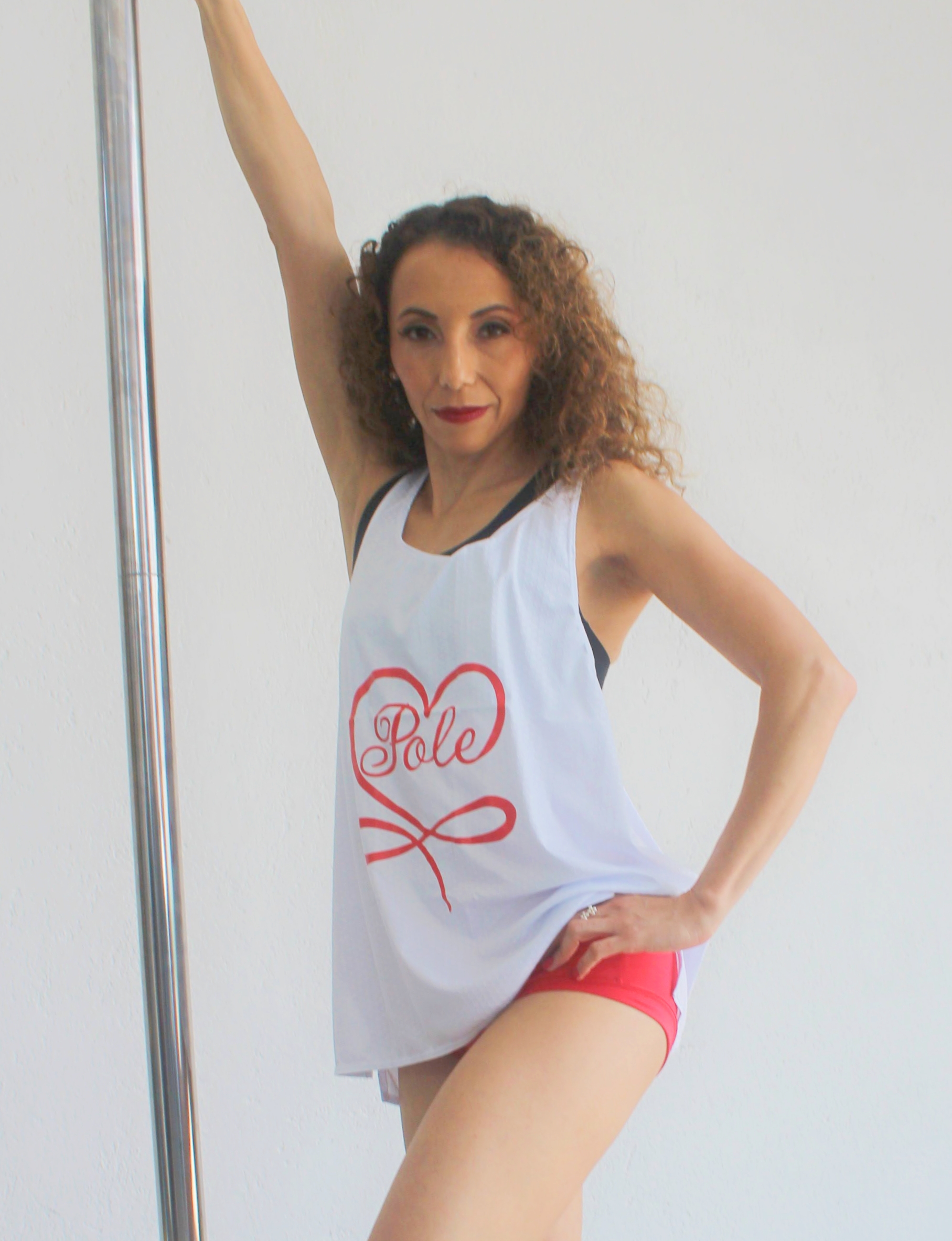 Playera Translucida en color rosa, esta confeccionada con maya strech de tejido abierto, resistente que permite el paso del viento. Estampada con la palabra pole entrelazada con Dance.