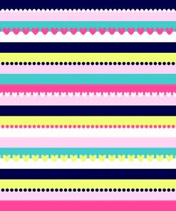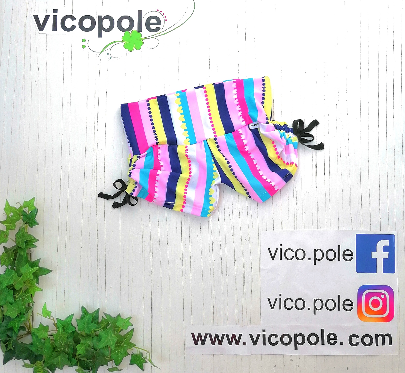 Short jaretas, corte con cinturilla alta y jaretas ajustables a los lados, estampado en color rosa rayado con lineas en blanco, aqua, marino y amarillo, decorado con alegres figuritas de corazones y bolitas.