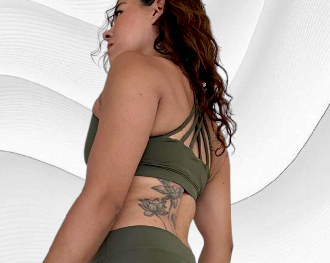 Top verde olive, modelo tiritas cruzadas en la espalda.